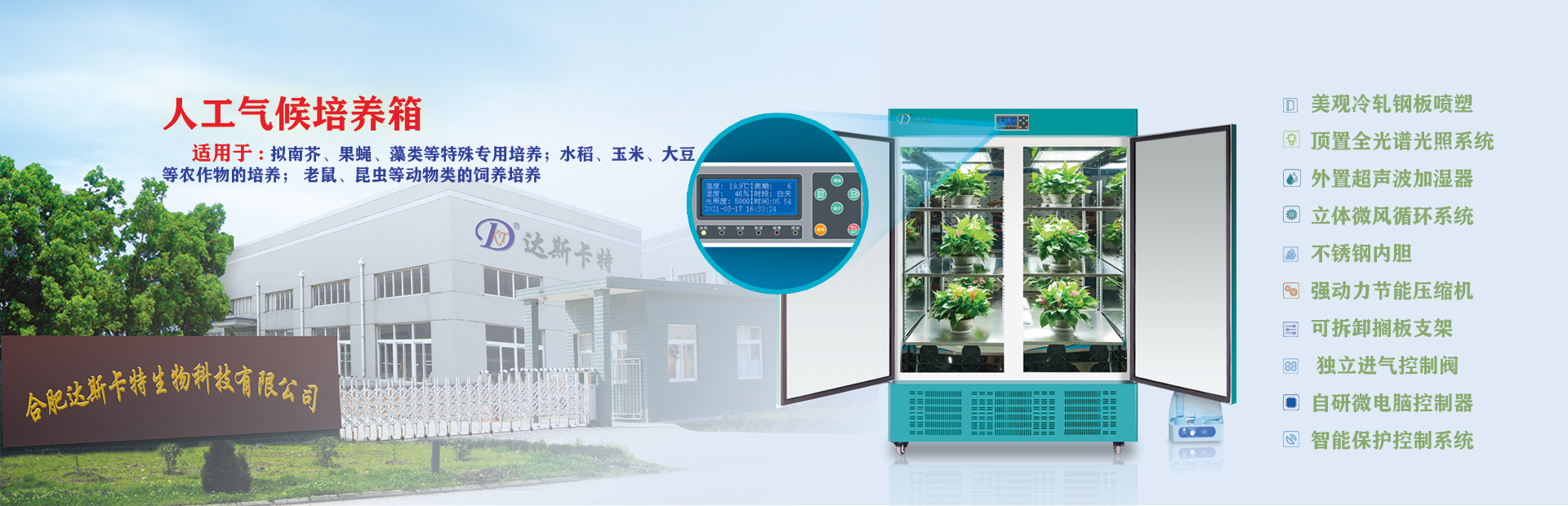 合肥達斯卡特生物科技有限公司前身是合肥華德利科學器材有限公司,擁有自足品牌“達斯卡特”。本公司是專業研發、生產制造、技術服務及市場營銷為一體的實業公司。公司自主研發的各類規格的干燥箱系列、恒溫箱系列、生化培養箱系列、光照培養箱系列、人工氣候箱系列、恒溫恒濕箱系列、二氧化碳人工氣候箱系列、低溫培養箱系列、超低溫保存箱系列、搖床系列、人工氣候室、植物生長室、冷庫、潔凈室等實驗室儀器設備及工程項目,特別是實驗室箱體類的產品目前擁有二十八大類、五十多個品種、八十多個規格、近三百多個型號。